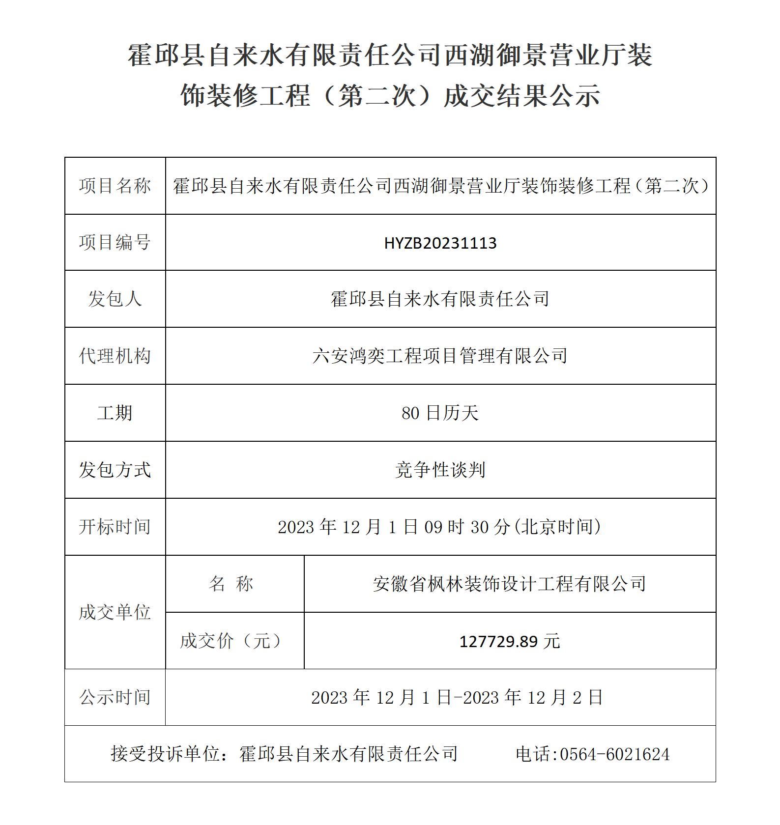 霍邱縣自來(lái)水有限責(zé)任公司西湖御景營(yíng)業(yè)廳裝飾裝修工程(第二次)成交結(jié)果公示