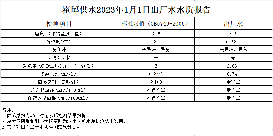 2023年1月1日出廠水水質(zhì)報(bào)告