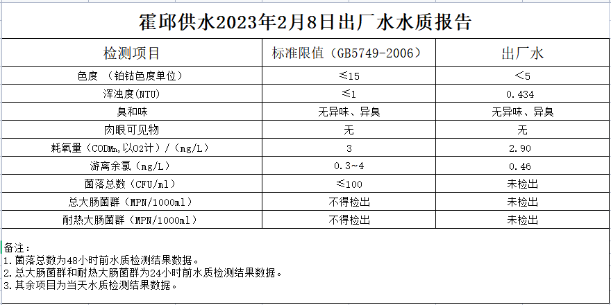 您現(xiàn)在的位置: 首頁 - 通知公告 - 水質(zhì)公告 - 出廠水水質(zhì)(8項(xiàng)) - 2023年2月8日出廠水水...