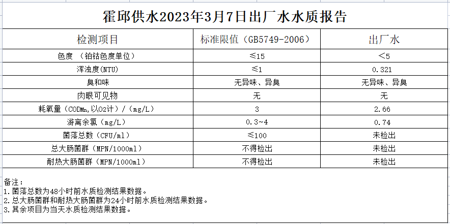 2023年3月7日出廠(chǎng)水水質(zhì)報(bào)告