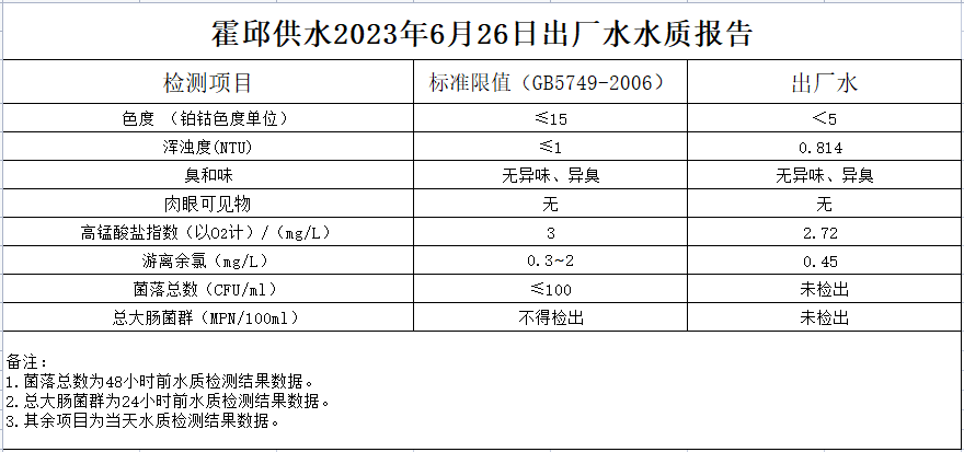 您現(xiàn)在的位置: 首頁 - 通知公告 - 水質(zhì)公告 - 出廠水水質(zhì)(8項) - 2023年6月26日出廠水水...