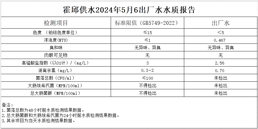 您現(xiàn)在的位置: 首頁 - 通知公告 - 水質(zhì)公告 - 出廠水水質(zhì)(8項) - 2024年5月6日出廠水水...