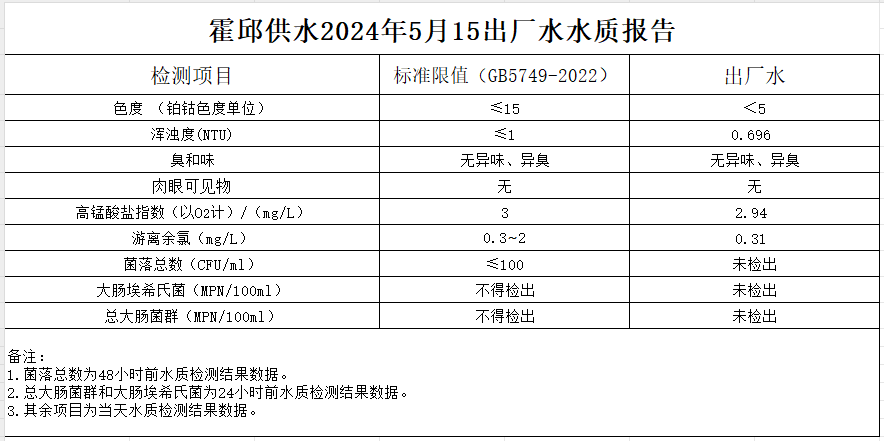 您現(xiàn)在的位置: 首頁 - 通知公告 - 水質(zhì)公告 - 出廠水水質(zhì)(8項) - 2024年5月15日出廠水水...