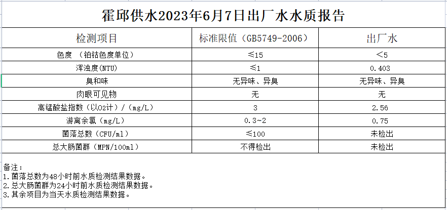 您現(xiàn)在的位置: 首頁 - 通知公告 - 水質(zhì)公告 - 出廠水水質(zhì)(8項) - 2023年6月7日出廠水水...